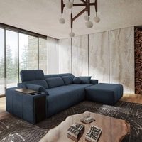 Narożnik z funkcją spania Rava VII błękitny lewostronny praktyczny i nowoczesny narożnik do salonu z regulowanymi zagłówkami