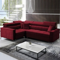 Narożnik z funkcją spania Nausa bordowy prawostronny velvet stylowy komfortowy narożnik regulowane zagłówki pojemnik na pościel