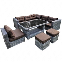 Zestaw mebli ogrodowych Maestoso szary niebanalny design modułowy narożnik ogrodowy komplet technorattanowy z dużym stołem i pufami