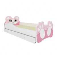 Łóżko Bear 70x140 cm biały / różowy małe łóżko z materacem i szufladą na pościel w kształcie misia z uroczym nadrukiem kotka