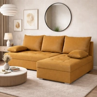 Narożnik z funkcją spania Fasti musztardowy uniwersalny w ustawieniu narożnik z pojemnikiem na pościel gwarancja najwyższego komfortu