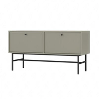 Szafka RTV Kioto III 121 cm eukaliptus elegancka szafka z drzwiami otwieranymi do dołu stonowana kolorystyka czarny metalowy stelaż