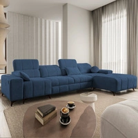 Narożnik z funkcją spania Penejos XII niebieski prawostronny stylowy narożnik z pojemnikami na pościel komfortowe regulowane zagłówki