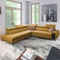 Narożnik z funkcją spania Bolmso IX musztardowy lewostronny komfortowy narożnik do salonu z szufladą pojemniki na pościel stylowy design