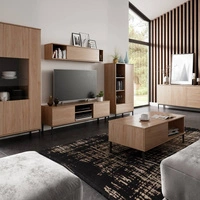Zestaw mebli Tutti dąb hikora prosta forma meblościanki bryły wsparte na metalowej czarnej podstawie bezuchwytowy system push to open