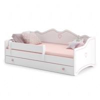Łóżko Emily 80x160 cm białe dziecięce łóżko z materacem i barierką ochronną różowe uchwyty w kształcie serca ozdobny nadruk