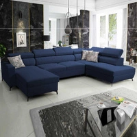Narożnik z funkcją spania Rava VII lazurowy prawostronny praktyczny i nowoczesny narożnik do salonu z regulowanymi zagłówkami