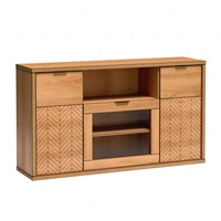 Komoda Fonti 158 cm dąb karmel elegancka stylistyka komody drzwi ozdobione dekorem jodełki czarne uchwyty krawędziowe przeszkolony front