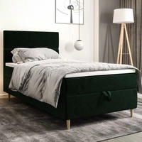 Łóżko kontynentalne Benet 90x200 butelkowa zieleń w nowoczesnym skandynawskim stylu z tapicerowanym zagłówkiem oraz zanóżkiem łóżko z pojemnikiem