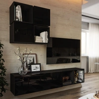 Meblościanka Nestorio czarna / czarny połysk stylowy design meblościanki wpisujący się w każde wnętrze szafka RTV z możliwością powieszenia