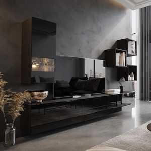 Meblościanka Aklion czarna / czarny połysk niezwykle stylowe meblościanka do salonu atrakcyjna pod względem wizualnym i funkcjonalnym
