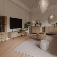 Zestaw mebli Tutti dąb hikora prosta forma meblościanki bryły wsparte na metalowej czarnej podstawie bezuchwytowy system push to open