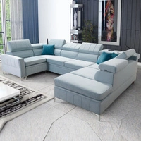 Narożnik z funkcją spania Rava VI błękitny prawostronny praktyczny i nowoczesny narożnik wyposażony w wielofunkcyjną lampkę