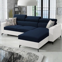 Narożnik z funkcją spania Savona granatowy / biały prawostronny elegancki narożnik z regulowanymi zagłówkami dekoracyjne przeszycia