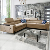 Narożnik z funkcją spania Viano XII Lux jasny brąz prawostronny designerski narożnik do salonu z komfortowym wysuwanym podnóżkiem