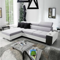 Narożnik z funkcją spania Castel II błękitny prawostronny komfortowy narożnik z regulowanymi zagłówkami pojemnik na pościel
