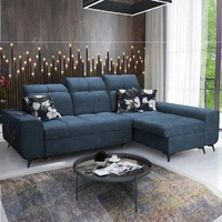 Narożnik z funkcją spania Bolmso VIII niebieski prawostronny elegancki i wygodny narożnik z szufladą idealny do przestronnych wnętrz