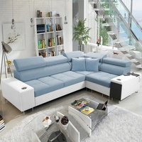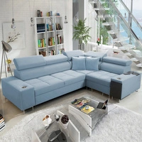 Narożnik z funkcją spania Castel II błękitny lewostronny komfortowy narożnik z regulowanymi zagłówkami pojemnik na pościel