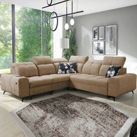 Narożnik z funkcją spania Belvi II ciemny beżowy prawostronny elegancki i ergonomiczny narożnik do salonu praktyczny schowek w boczku