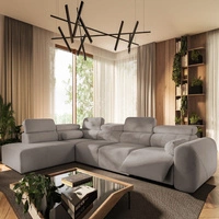 Narożnik z funkcją spania Viano VIII Lux jasny szary lewostronny designerski narożnik z wysuwanym podnóżkiem pojemniki na pościel