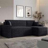 Narożnik z funkcją spania Brandon Bis czarny prawostronny miękka tkanina o charakterystycznej pętelkowej powierzchni pojemnik na pościel
