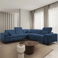 Narożnik z funkcją spania Penejos III Lux niebieski lewostronny komfortowy narożnik do salonu z wysuwanym podnóżkiem pojemnik na pościel