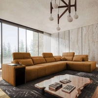 Narożnik z funkcją spania Tesalia XI miodowy prawostronny nowoczesny narożnik z komfortowym przesuwanym oparciem i pojemną szufladą