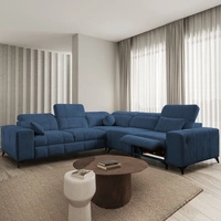 Narożnik z funkcją spania Nausa III granatowy lewostronny velvet stylowy komfortowy narożnik regulowane zagłówki pojemnik na pościel