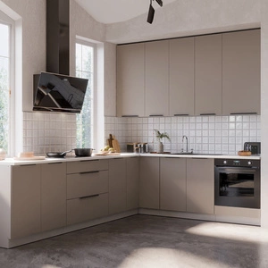 Zestaw mebli kuchennych narożny Brianza 310x250 cm metalowe uchwyty krawędziowe szafki doskonale prezentują się w nowoczesnych wnętrzach