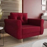 Fotel Wilkins bordowy elegancki fotel do salonu z obszernym i miękkim siedziskiem drewniane nóżki nadają wizualnej lekkości