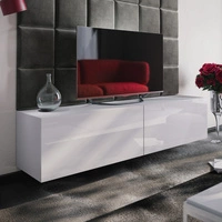 Szafka RTV Nea 180 cm biała / biały połysk z możliwością powieszenia i półkami stylowy design wpisujący się w każde wnętrze