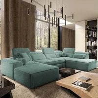 Narożnik z funkcją spania Viano szary błękit lewostronny stylowy narożnik o ciekawym kształcie regulowane zagłówki ozdobne poduszki