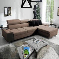 Narożnik z funkcją spania Cetara II brązowy prawostronny stylowy design przesuwane oparcia regulowane zagłówki i pojemnik na pościel