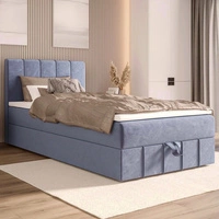 Łóżko kontynentalne Arvada 90x200 błękitne w nowoczesnym skandynawskim stylu z tapicerowanym zagłówkiem łóżko z pojemnikiem
