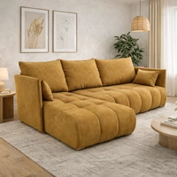 Narożnik z funkcją spania Selva miodowy uniwersalny narożnik z pojemnikiem na pościel velvetowa tkanina o ciekawej strukturze