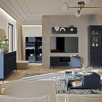 Zestaw mebli do salonu Linka indigo stylowe meble z ciekawym wzorem na frontach w postaci frezowanych ryfli czarne metalowe nogi
