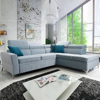 Narożnik z funkcją spania Penejos XII niebieski prawostronny stylowy narożnik z pojemnikami na pościel komfortowe regulowane zagłówki