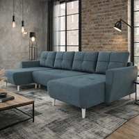 Narożnik z funkcją spania Castel VII błękitny lewostronny stylowy narożnik z pojemnikiem na pościel i regulowanymi zagłówkami