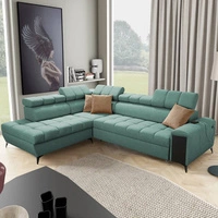 Narożnik z funkcją spania Bolmso VII miętowy prawostronny elegancki narożnik do salonu z szufladą i pojemnikiem na pościel
