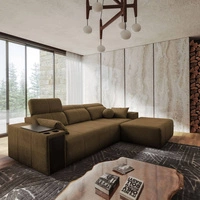 Narożnik z funkcją spania Tesalia brązowy prawostronny nowoczesny design komfortowe przesuwane oparcie szuflada w boczku mebla