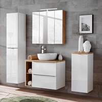 Zestaw mebli łazienkowych Capri biały połysk / dąb craft złoty funkcjonalne szafki łazienkowe z metalowymi uchwytami krawędziowymi