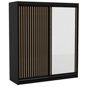 Szafa przesuwna z lustrem Delia 180 cm czarna stylowa szafa z ozdobnymi lamelami w kolorze drewna wpasuje się do każdej aranżacji