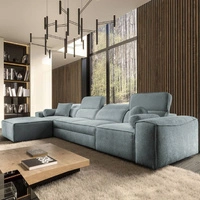 Narożnik z funkcją spania Tesalia VIII niebieski prawostronny komfortowy narożnik do salonu z innowacyjną funkcją przesuwanego oparcia