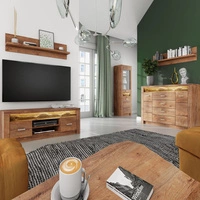 Zestaw mebli do salonu Indiana jesion jasny gustowna stylistyka mebli ozdobna deska na froncie oświetlona LED elementy z bezpiecznego szkła