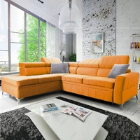 Narożnik z funkcją spania Rava III żółty lewostronny velvet komfortowy narożnik z regulowanymi zagłówkami i pojemnikiem na pościel