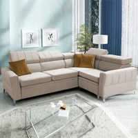 Narożnik z funkcją spania Rava II jasny beż prawostronny velvet komfortowy narożnik z pojemnikiem na pościel wielofunkcyjna lampka