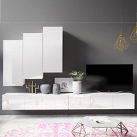 Zestaw mebli Tutti biały prosta forma meblościanki bryły wsparte na metalowej czarnej podstawie bezuchwytowy system push to open