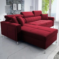 Narożnik z funkcją spania Nausa bordowy lewostronny velvet stylowy komfortowy narożnik regulowane zagłówki pojemnik na pościel