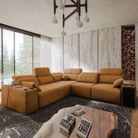 Narożnik z funkcją spania Tesalia III miodowy prawostronny komfortowy narożnik z przesuwanym oparciem dwa pojemniki na pościel