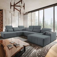 Narożnik z funkcją spania Rava VII błękitny prawostronny praktyczny i nowoczesny narożnik do salonu z regulowanymi zagłówkami